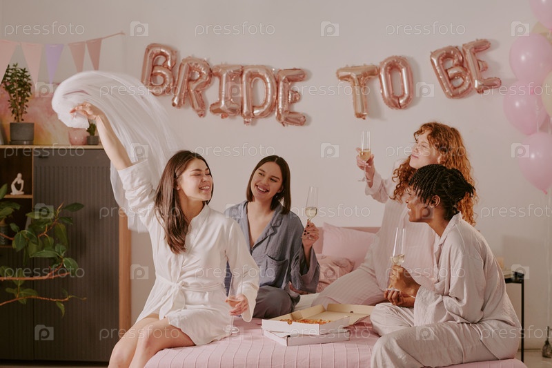 Мультиэтнические молодые взрослые женщины, болеющие за шампанское и пиццу на вечеринке бакалавра