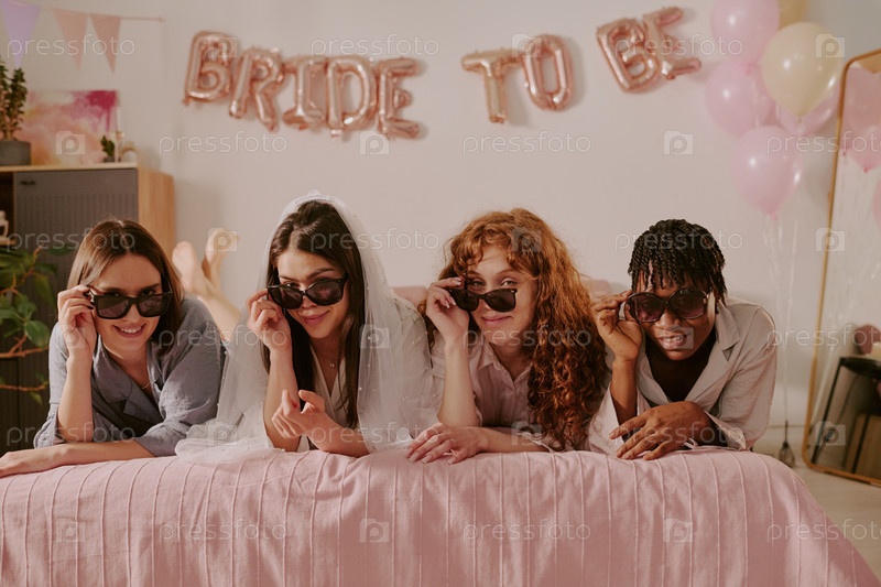 Группа молодых взрослых мультиэтнических женщин, улыбающихся и позирующих на бакалаврской вечеринке