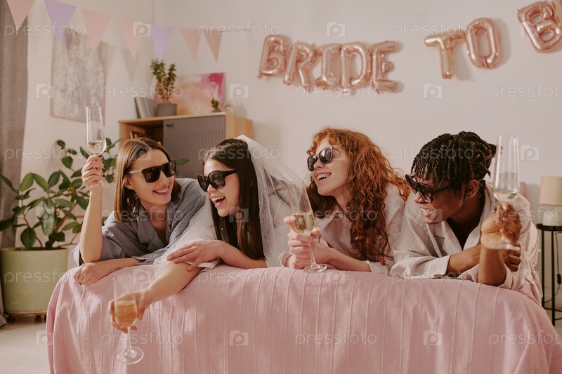Разнообразные молодые взрослые женщины смеются и выпивают шампанское на бакалаврской вечеринке