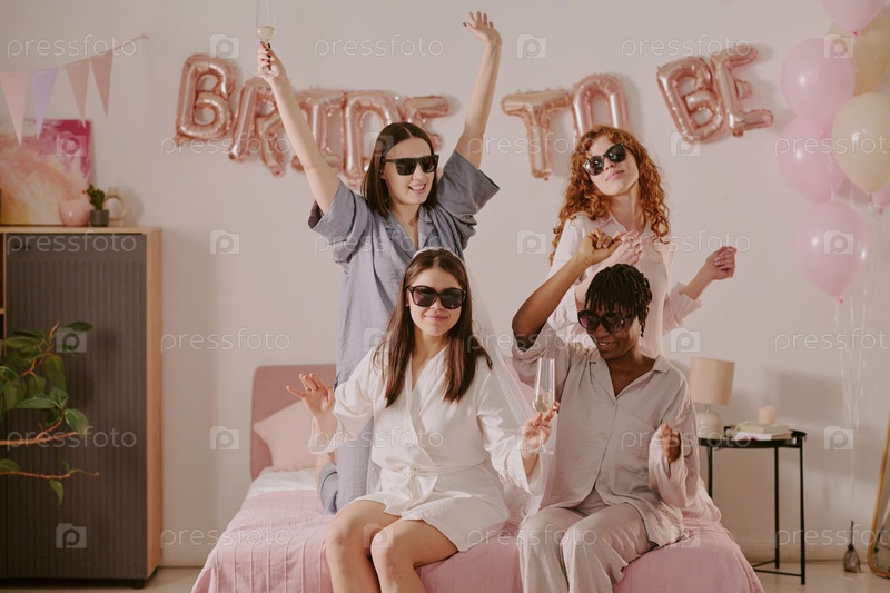 Разнообразные молодые взрослые женщины празднуют свадебную вечеринку и позируют вместе