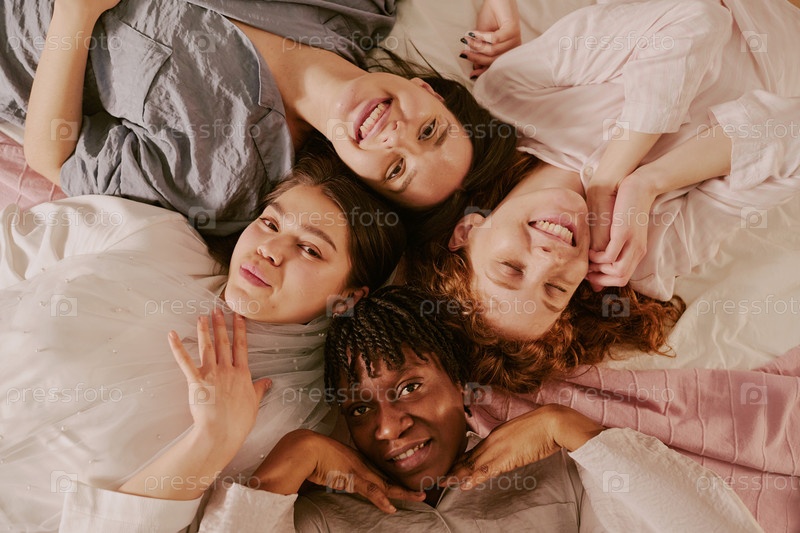 Разнообразные молодые взрослые женщины, лежащие на кровати улыбаясь во время бакалавриата
