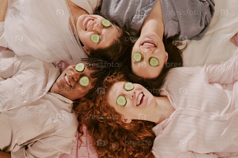 Разнообразные молодые взрослые женщины, расслабляющиеся кусочками огурцов во время бакалаврской вечеринки