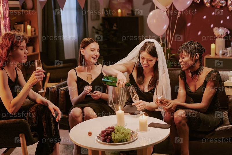 Группа молодых взрослых женщин, празднующих свадебную вечеринку и наливающую шампанское
