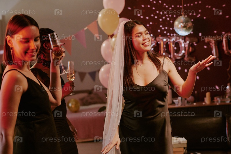 Молодые взрослые и азиатские женщины празднуют свадебную вечеринку в помещении