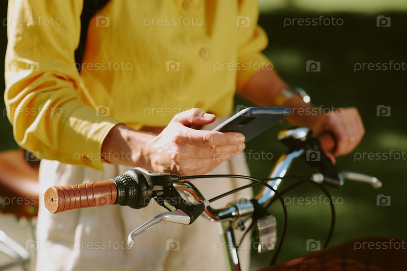 Молодая взрослая женщина использует смартфон, стоя с велосипедом на улице