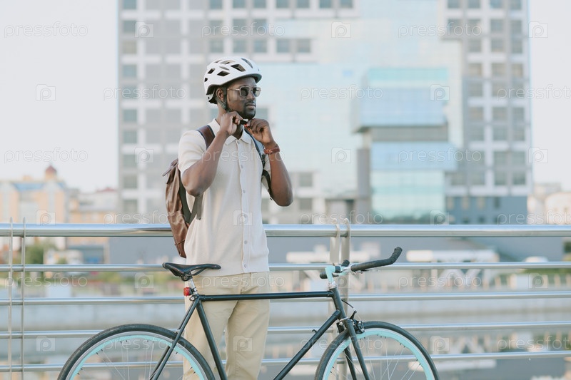 Молодой взрослый чернокожий мужчина регулирует шлем, стоя рядом с велосипедом на открытом воздухе