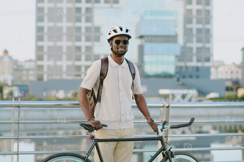 Молодой взрослый чернокожий мужчина стоит на улице, держит велосипед, носит шлем и улыбается