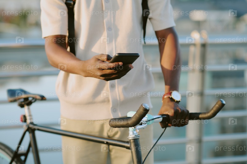 Молодой взрослый чернокожий мужчина использует смартфон, стоя рядом с велосипедом на открытом воздухе