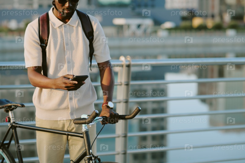 Молодой взрослый чернокожий мужчина проверяет сообщения, держа велосипед возле набережной