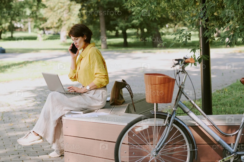 Женщина средних лет, работающая на ноутбуке и разговаривающая со смартфоном в открытом воздухе