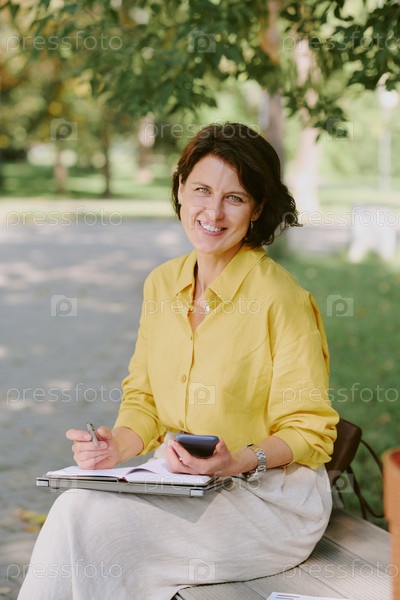Портрет женщины среднего возраста, улыбающейся во время работы на свежем воздухе