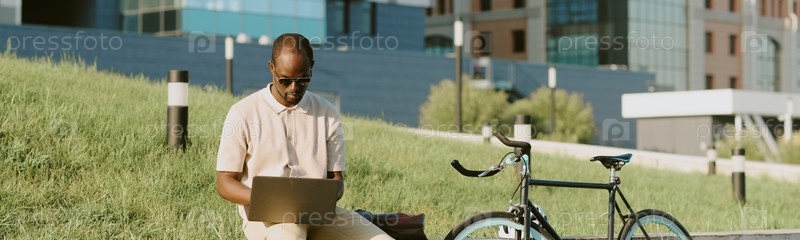 Молодой взрослый чернокожий мужчина сидит на улице, используя ноутбук возле велосипеда на траве