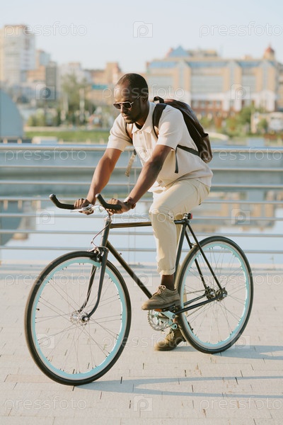 Молодой взрослый чернокожий мужчина катается на велосипеде вдоль водного пути, неся рюкзак