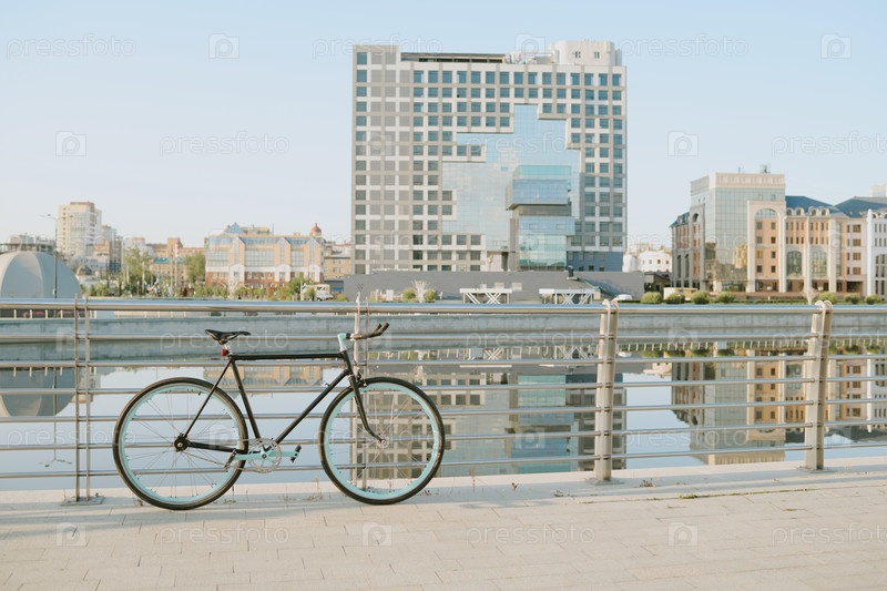 Винтажный велосипед стоит возле городского набережной с современными зданиями, отражающимися