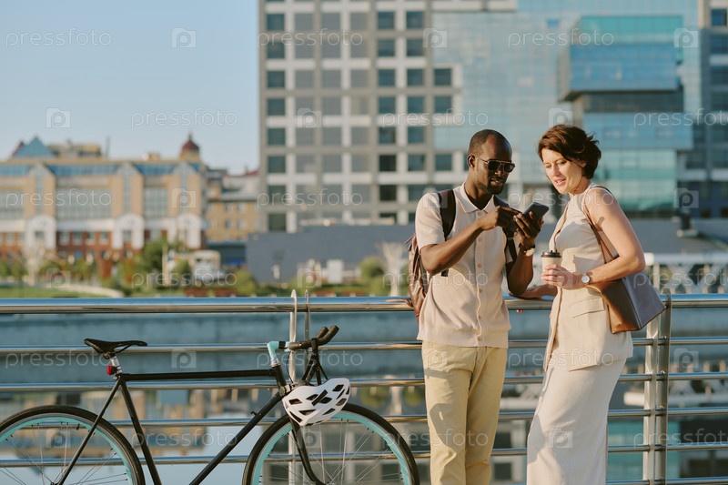 Молодой взрослый чернокожий мужчина и женщина, использующие смартфоны на открытом воздухе вместе