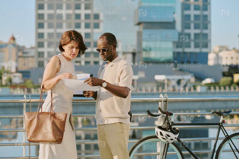 Молодая женщина и молодой чернокожий мужчина обсуждают карту на открытом воздухе возле реки