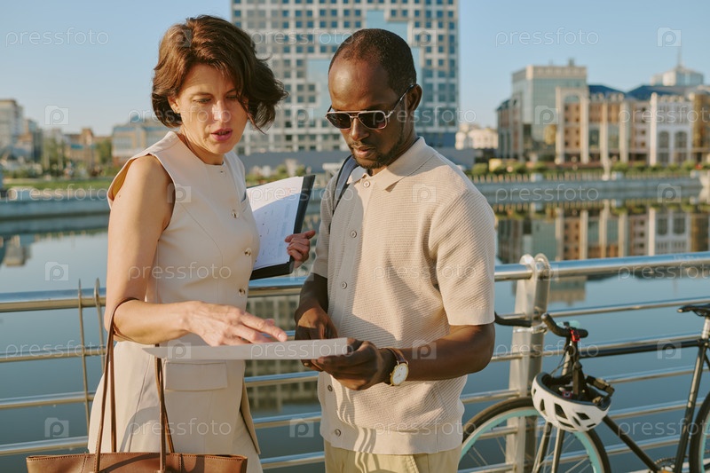 Женщина среднего возраста и молодой чернокожий мужчина обсуждают документы на открытом воздухе