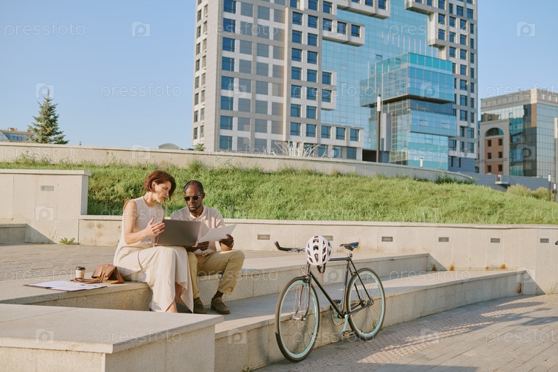 Молодая женщина и чернокожий мужчина сотрудничают на открытом воздухе с ноутбуком