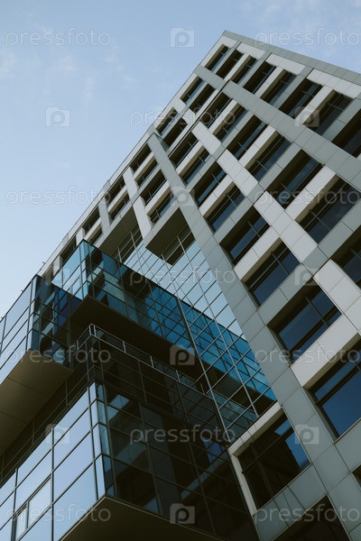 Экстериор офисного здания с стеклянным фасадом против современного голубого неба