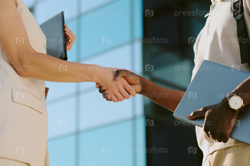 Женщина и чернокожий мужчина пожали друг другу руки на открытом воздухе во время деловой встречи