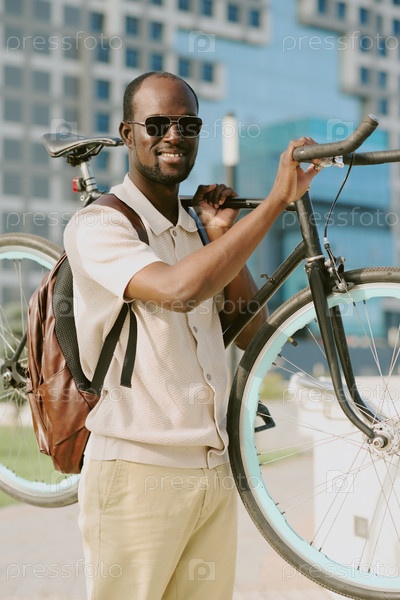 Молодой взрослый чернокожий мужчина улыбается, неся велосипед на улице в городской зоне