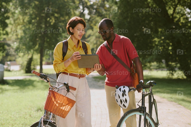 Молодая женщина и молодой чернокожий мужчина используют планшет во время ходьбы на велосипедах