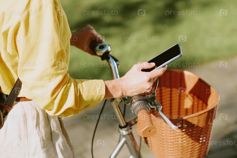 Молодая взрослая женщина держит смартфон, стоя рядом с велосипедом