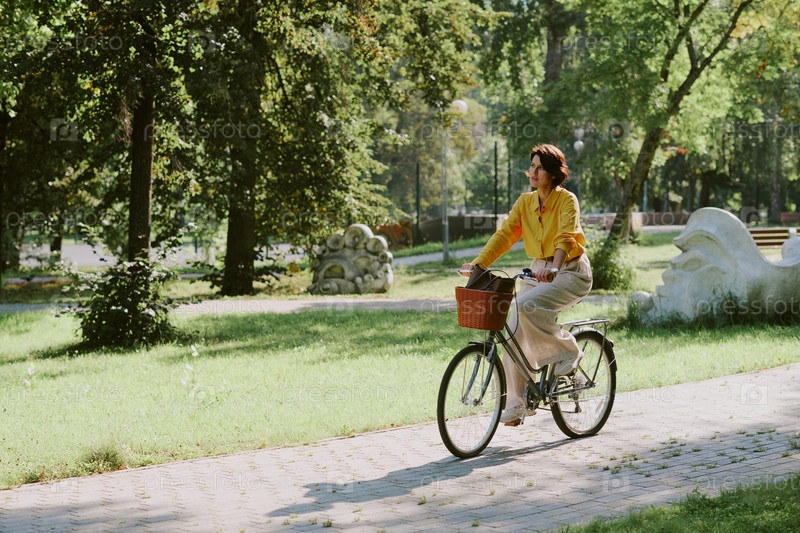 Женщина среднего возраста едет на велосипеде вдоль дорожки парка утром под солнечным светом