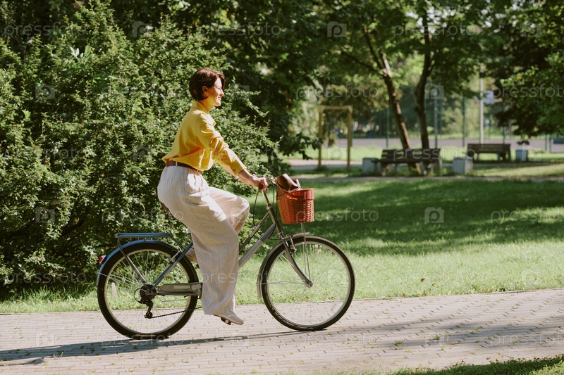 Молодая взрослая женщина едет на велосипеде через солнечный городской парк