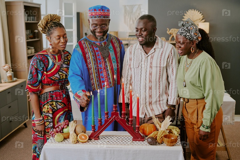 Чернокожий мужчина среднего возраста освещает Кинару В окружении молодых черных взрослых, улыбающихся