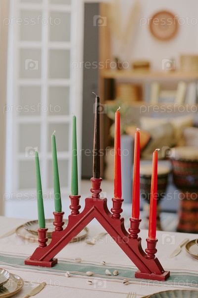 Kinara Candle Holder Displaying Lit Candles Celebrating Kwanzaa Tradition (Удерживатель свечей Кинара, демонстрирующий зажженные свечи с празднованием традиции Кванза)