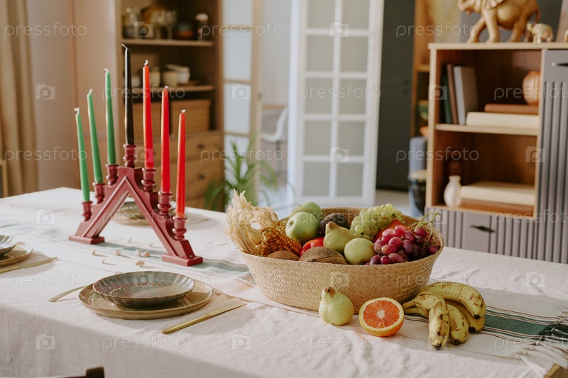 Kwanzaa Kinara с семью свечами стоит на столе рядом со фруктовой корзиной