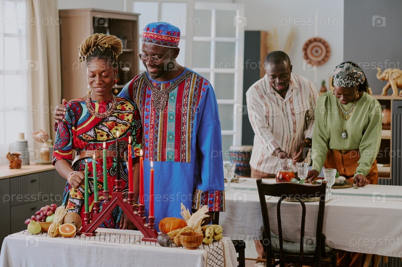 Черная пара среднего возраста зажигает свечи Кинара, отмечая праздник Кванзаа