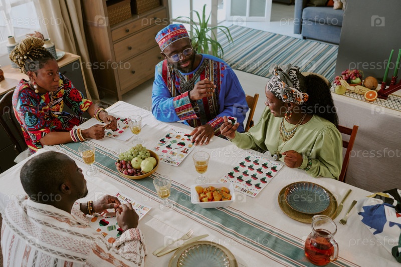 Черная семья празднует Кванзаа, делясь едой и играя в традиционную игру