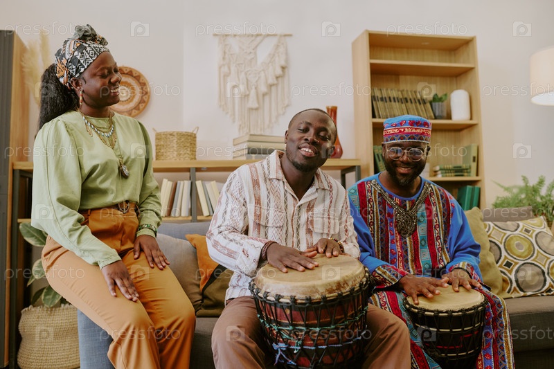 Молодые чернокожие взрослые празднуют Кванза, играя на барабанах и улыбаясь в помещении