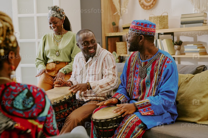 Группа чернокожих взрослых празднует Кванза, играя на традиционных барабанах в помещении
