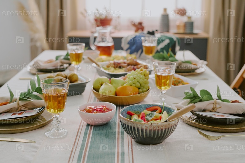Таблица празднования Кванзаа, демонстрирующая праздничную еду и традиционный декор