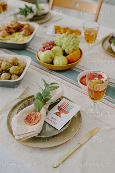 Установка стола Kwanzaa с праздничной карточкой и традиционным праздничным блюдом