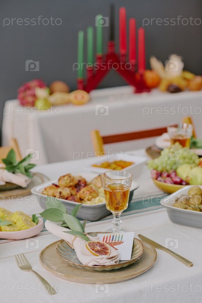 Настройка стола Kwanzaa с традиционной едой и держателем свечей Kinara