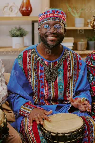 Портрет чернокожего мужчины среднего возраста, который празднует Кванзаа, играя на барабанах и улыбаясь