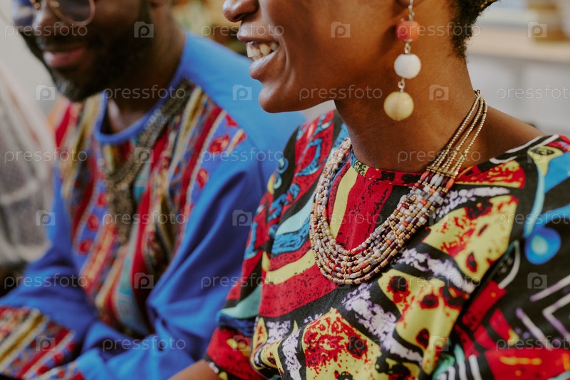 Молодой чернокожий мужчина и женщина улыбаются и празднуют Кванза вместе в помещении