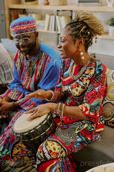 Молодая черная женщина играет на барабане рядом с молодым темнокожим мужчиной во время празднования Кванзаа