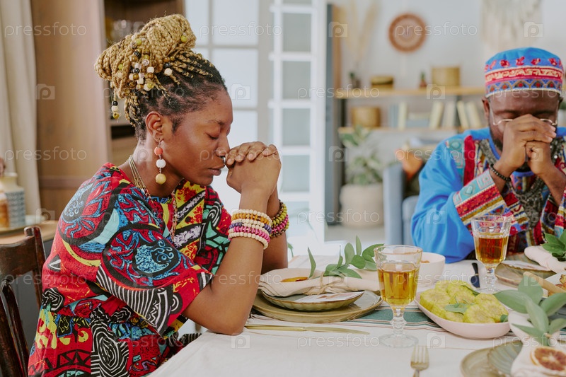 Черная женщина и черный мужчина молятся перед едой во время празднования Кванзаа