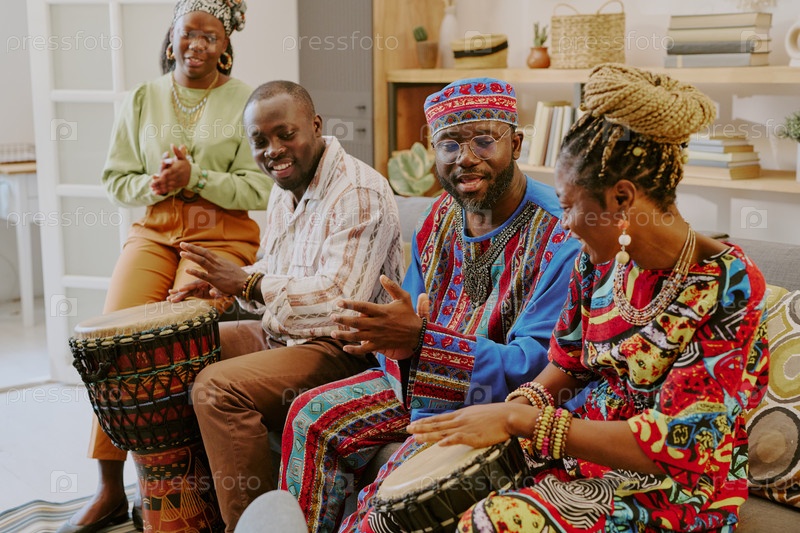 Группа чернокожих взрослых, празднующих Кванзаю, играя на барабанах и улыбаясь в помещении