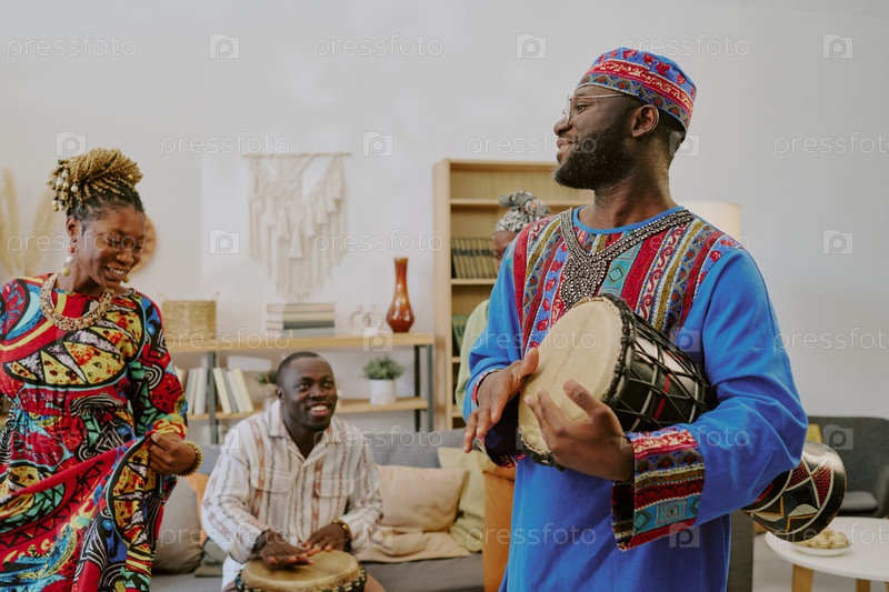 Молодой чернокожий мужчина играет на барабанах во время празднования Кванза с друзьями в помещении