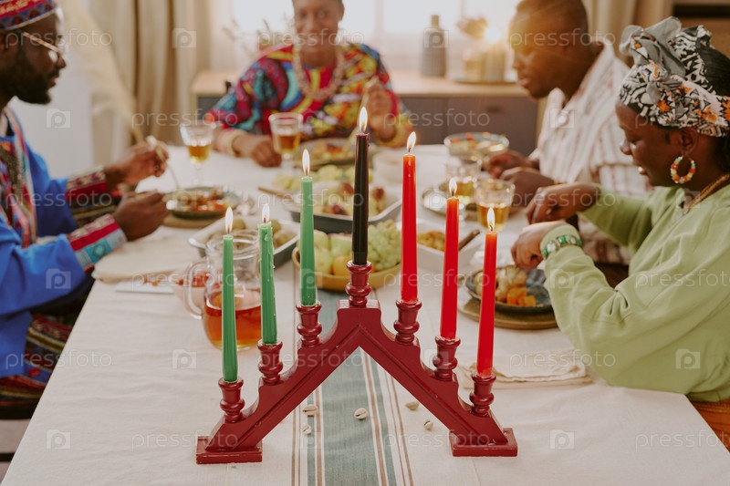 Группа чернокожих взрослых, празднующих ужин Кванзаа и делящихся традиционной едой