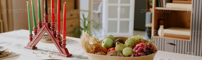 Kwanzaa Kinara с семью свечами Стоя рядом с корзиной, держащей свежие фрукты