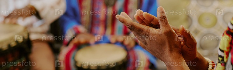 Взрослые чернокожие хлопают в ладоши, отмечая Кванзаа с традиционными барабанами