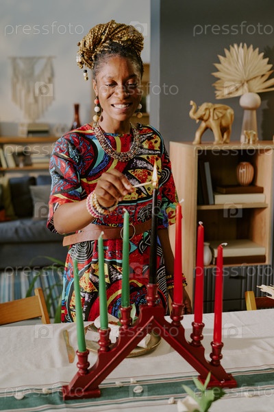 Молодая взрослая чернокожая женщина зажигает свечи Кинара, отмечая традицию Кванзаа