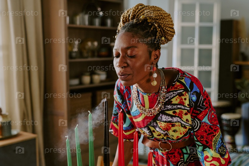 Молодая взрослая чернокожая женщина дует в свечи Kwanzaa во время празднования